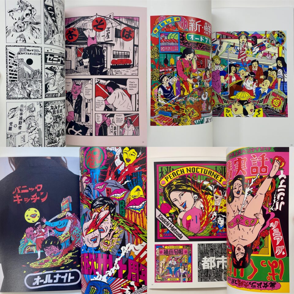 2025年に開催された mograg gallery および WISH LESS gallery における展示作品を中心に、アパレルやスケートボードデッキ、ポスター、フライヤーなど、多彩なデザインワークを収録。さらに、作家の主戦場である漫画作品として、英語版『OSOBA』他も併載し、松田光市の幅広い表現世界を紹介しています。